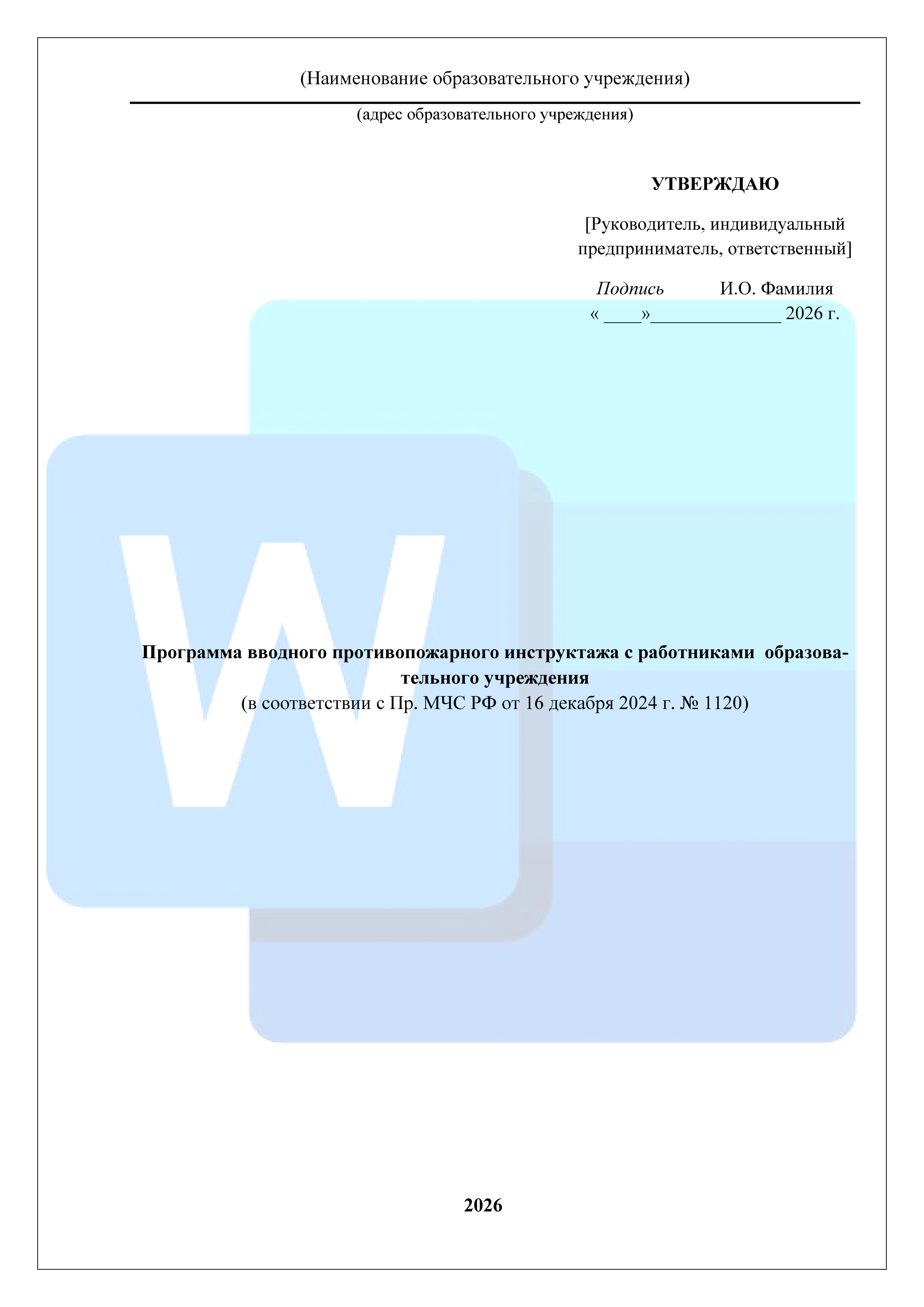 Особенности: титульный лист с грифом «УТВЕРЖДАЮ», структура адаптирована под требования образовательных учреждений, все текстовые блоки доступны для правки.